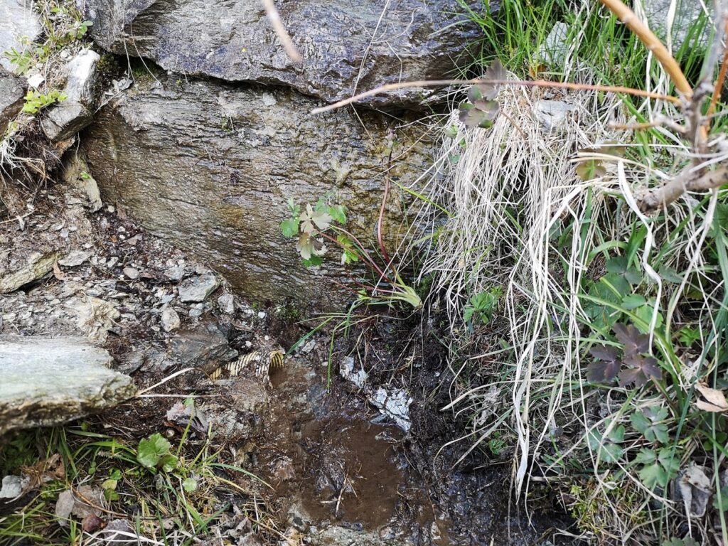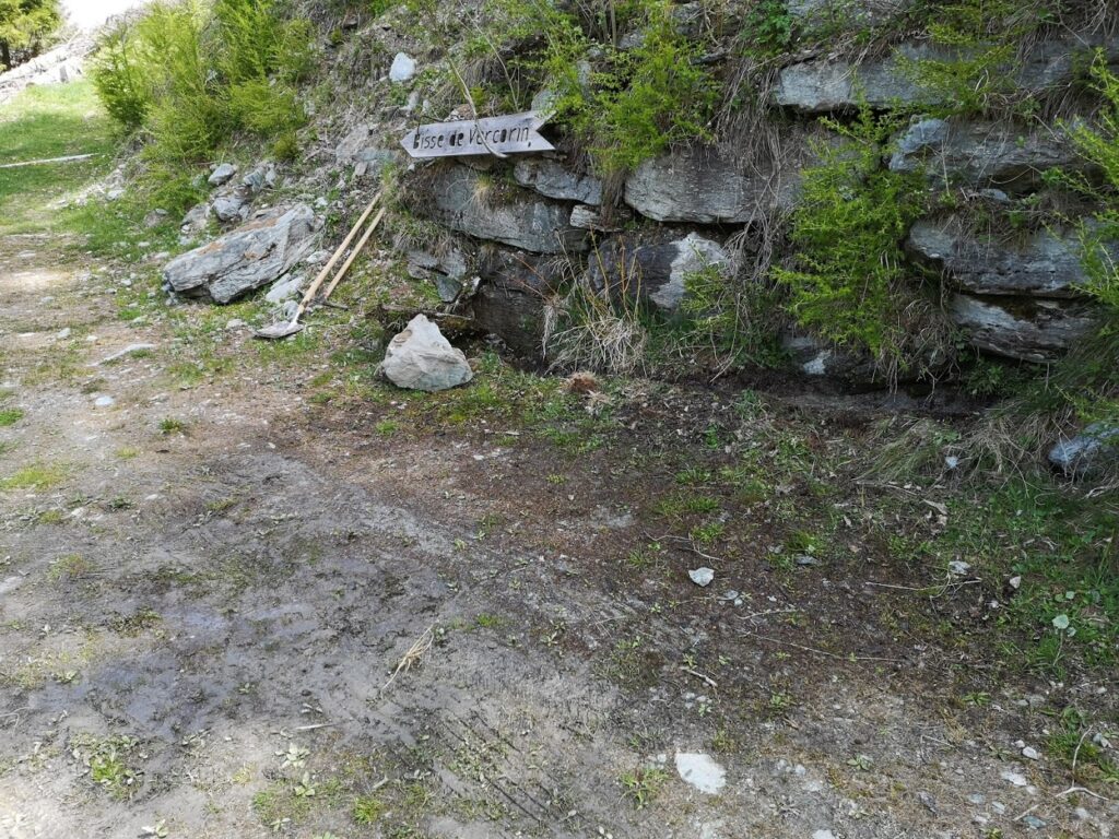 Il faut curer le bisse au pied de l’enrochement jusqu’au tuyau orange qui amène l’eau ensuite dans le tuyau noir qui lui traverse la place d’évacuation jusque dans le pré en-dessous.